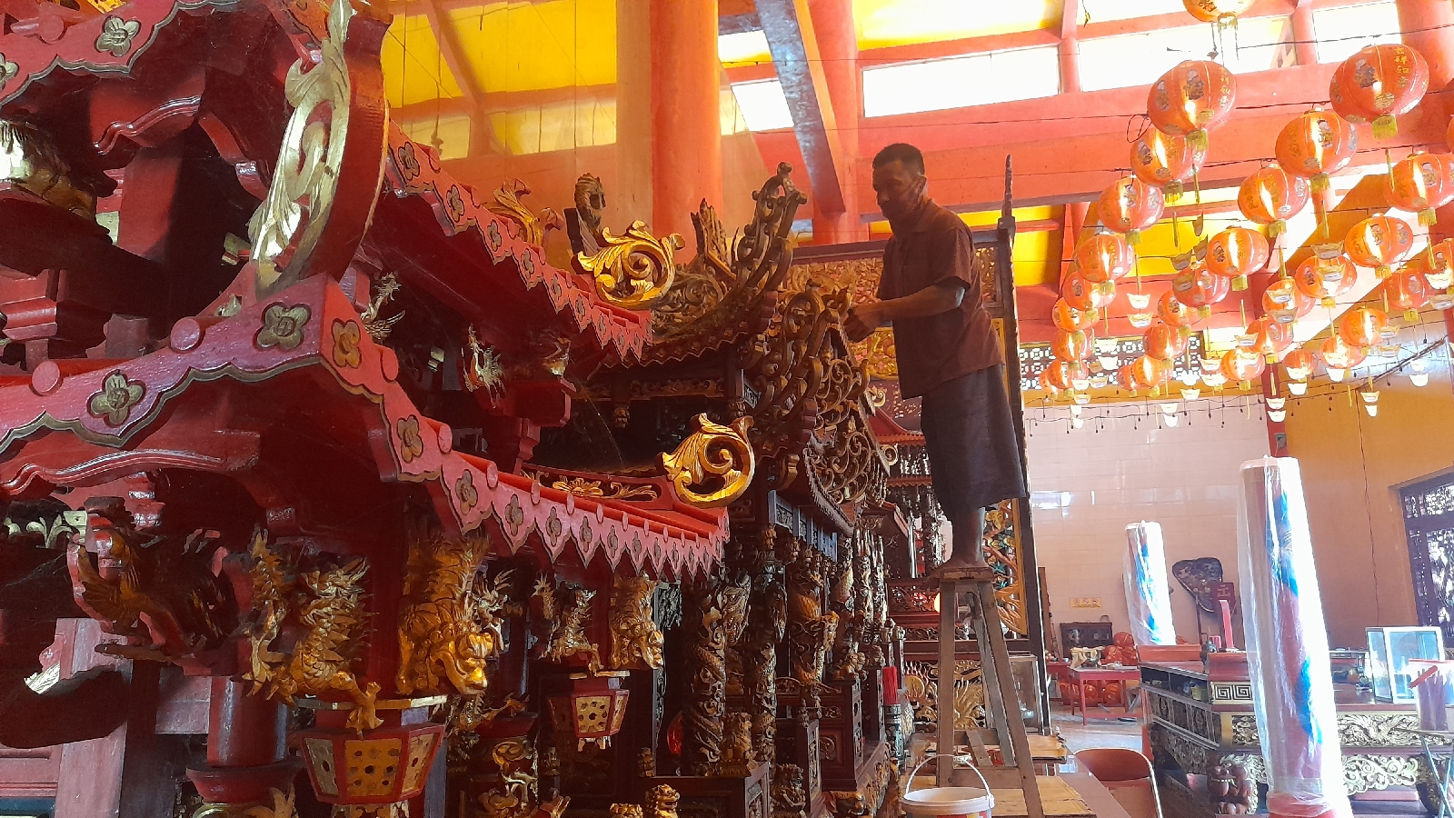 Blora, ME- Menyambut tahun baru imlek 2575, Warga konghuchu di Blora Jawa tengah mulai melakukan bersih-bersih klenteng Hok Tik Bio, Minggu (4/2). Kegiatan dilakukan dengan membersihkan patung-patung dewa serta mengayak abu leluhur.